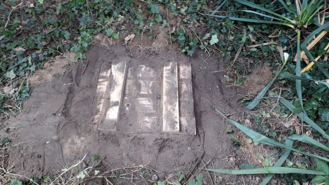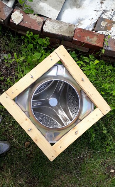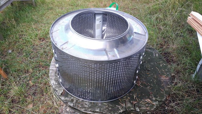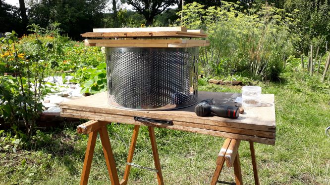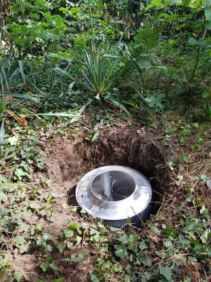Sie wird uns als Bodenkeller oder Erdmiete dienen. Schon früher haben Menschen Erdmieten genutzt um Gemüse kühl zu lagern. Warum eine Erdmiete im Tifu? „Um die jährliche Neubestellung von Saatkartoffeln zu minimieren. Ein Teil der eigenen Kartoffeln kann eingelagert werden und im nächsten Jahr wieder verwendet werden. Es können besonders schöne Wurzelgemüse eingelagert werden, die im nächsten Jahr zur Blüte gebraht werden sollen.“Die Trommel aus Edelstahl ist Mäuseschutz. Die Öffnung ist mit einem Holzrahmen verbunden und mit einem festen Deckel versehen. Das Loch im Boden unter der Fichte war schnell ausgehoben und mit Sand zur Drainage ausgekleidet. Trommel hinein, mit Aushub aufgefüllt , fertig! Nun kann das erwählte Gemüse einziehen. Die Hohlräume im Inneren werden mit Sand ausgefüllt das dient dem Frostschutz. Dazu wird oben auf noch etwas Stroh gelegt oder auch eine Plane befestigt als Regenschutz.Mehr braucht es nicht um aus einer Waschmaschine einen Kühlschrank zu machen. Und das ganz ohne Strom. Sehr nachhaltig und im Sinne der Permakultur.